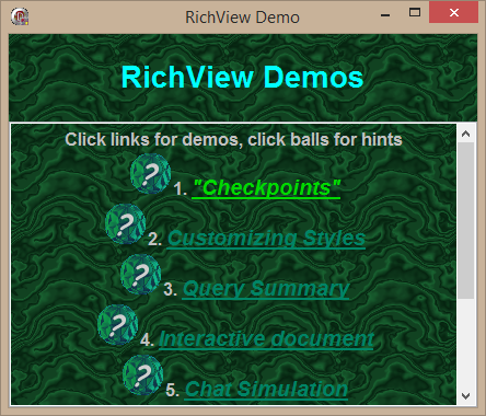 Большинство из приведённых ниже примеров не содержит исходного кода, но указано его нахождение в инсталляции TRichView или ScaleRichView.