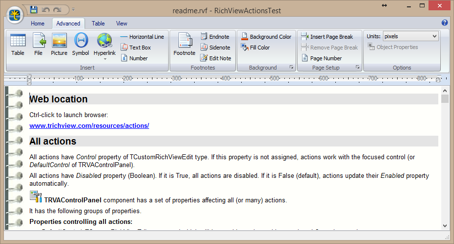 RichViewActions — средства для создания пользовательского интерфейса редактора текста, включающие команды для работы с файлами, печати, изменения аттрибутов текста, вставки объектов в документ, изменения таблиц и т.д.